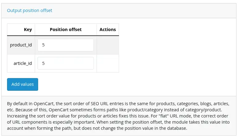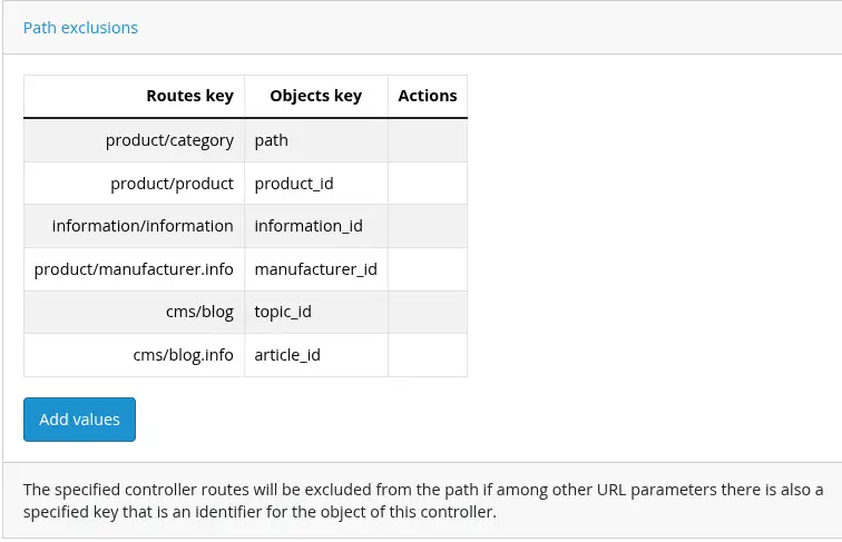Version 1.1.0 adds the ability to create and edit SEO records of routes of the main Opencart controllers such as the Main Blog Page (cms/blog), Product Comparison (product/compare), Brand List Page (product/manufacturer) and many others.