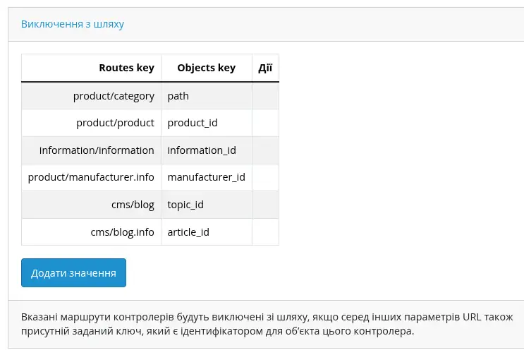 Основна відмінність і перевага цього модуля від стандартного SEO URL полягає в тому, що модуль дозволяє виключати з шляху загальні папки, які стосуються певного контролера. Наприклад: