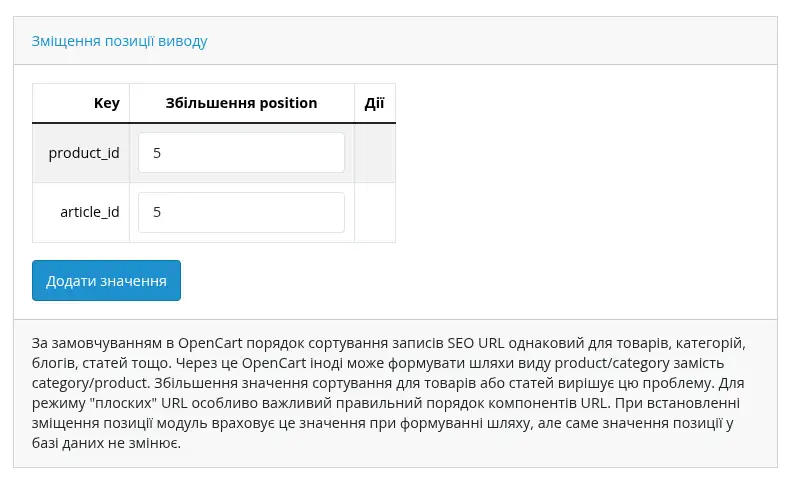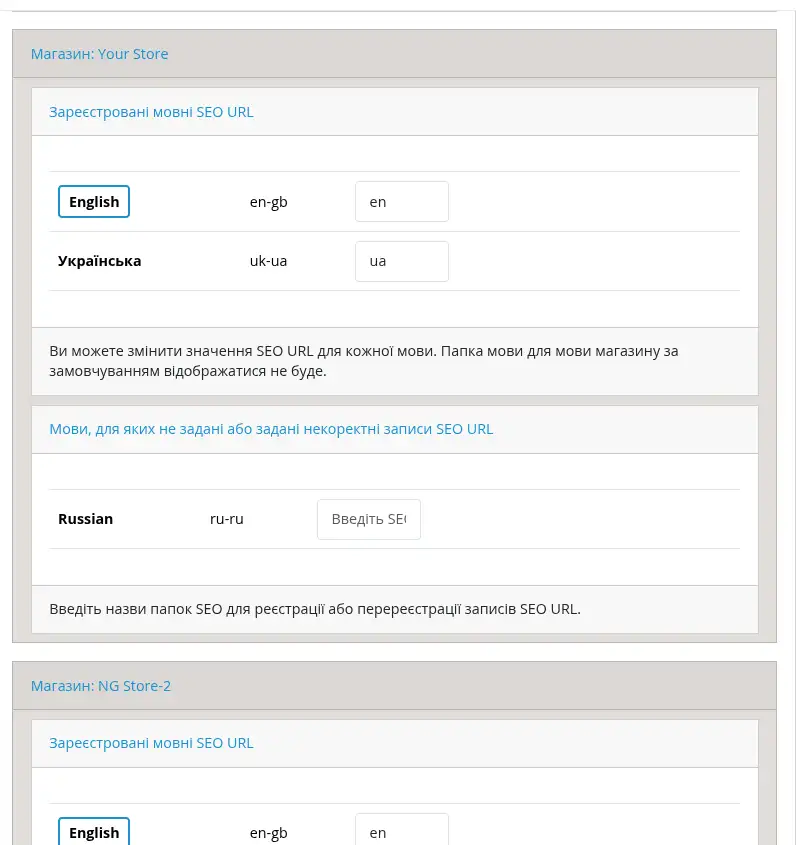 Модуль перевіряє наявність та коректність SEO записів для встановлених у системі мовних пакетів. Якщо якісь записи некоректні або відсутні, модуль просто запропонує задати нове значення мовної папки і після збереження налаштувань автоматично їх коректно перестворить. Також це налаштування дозволяє легко змінити значення мовної папки для якоїсь мови.